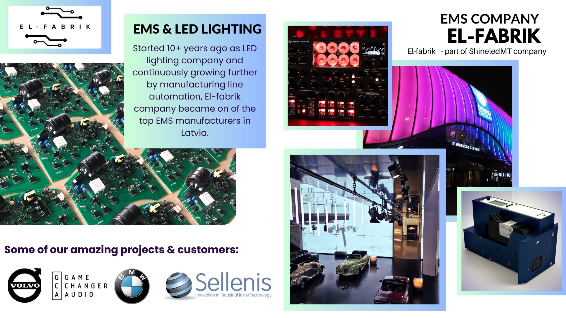 Shine-LED is a EMS company based in Latvia. We are proud to have projects completed in Japan, Germany, the UK, the UAE, and other countries. The products/product parts we have manufactured are audio devices (e.g., Gamechanger Audio), medical equipment, printers, etc. We offer a full manufacturing cycle for any microelectronics product from prototype to the ready device. Our manufacturing includes SMT (Surface-mount technology), AOI (Automated Optical Inspection), PVA (Conformal coating & dispensing) equipment, Martin rework station. Additionally, we offer THT (Through Hole) operations and testing. We follow best practices to ensure the high quality of products manufactured and are ISO9001 and ISO14001 certified. Currently, we are working on our own product